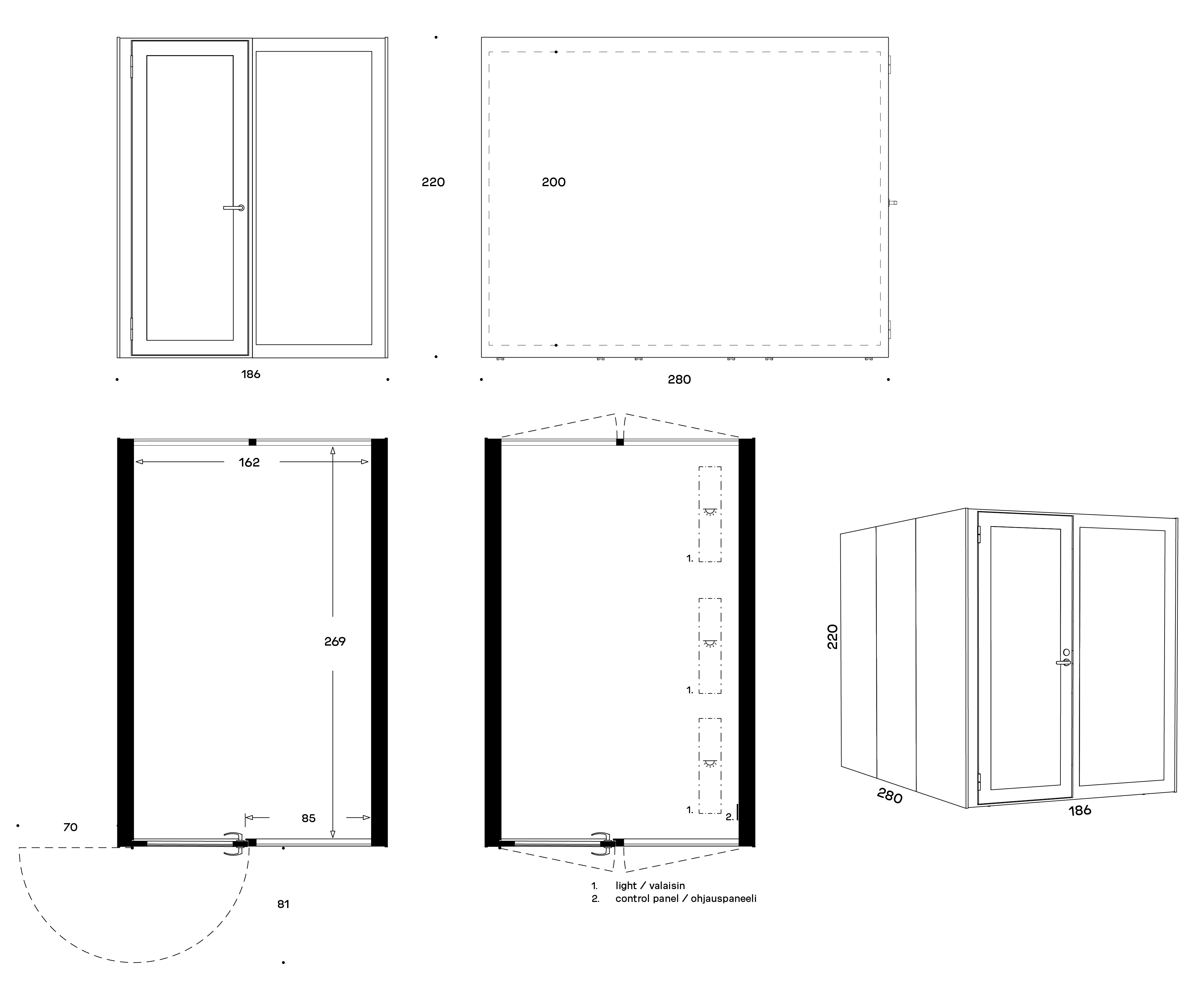 Sono Work L -työskentelytilassa on runsaasti tilaa erilaisiin käyttötarkoituksiin. Voit sijoittaa tilaan esimerkiksi kaksi vierekkäistä työpistettä, kulmasohvan rennompaa neuvottelua varten tai varustele tilasta vaikka asiakaspalvelupiste. Vakiovarusteisiin kuuluvat siirtelyä helpottavat rullat sekä liiketunnistimella ohjattu valaistus ja ilmanvaihto. Oven paikka on valittavissa.