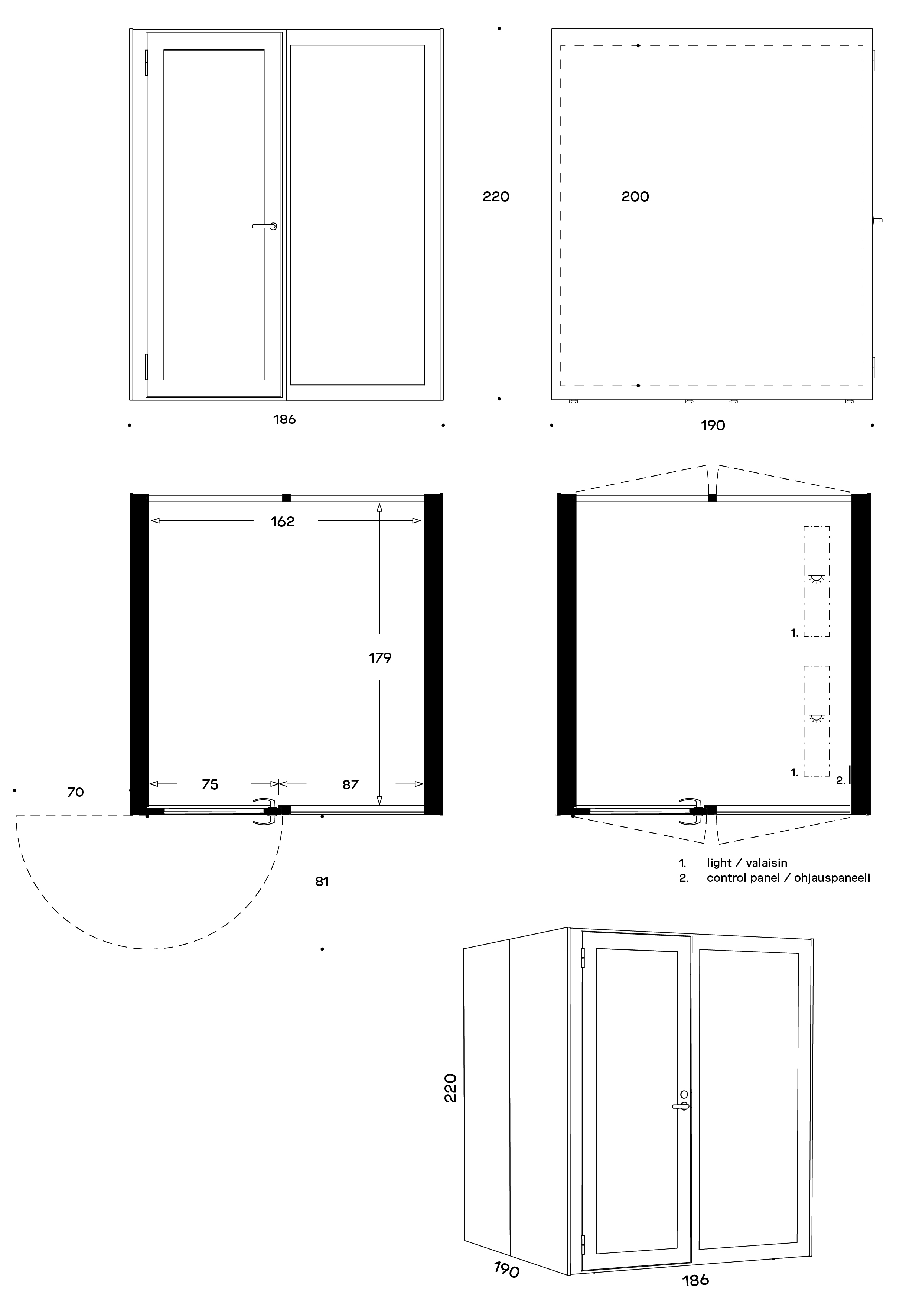 Sono Work M -työskentelytilassa on tilaa täysikokoiselle työpisteelle (160 x 80 cm) ja se soveltuu erinomaisesti myös pidempiaikaiseen työskentelyyn. Vakiovarusteisiin kuuluvat siirtelyä helpottavat rullat sekä liiketunnistimella ohjattu valaistus ja ilmanvaihto. Oven paikka on valittavissa.
