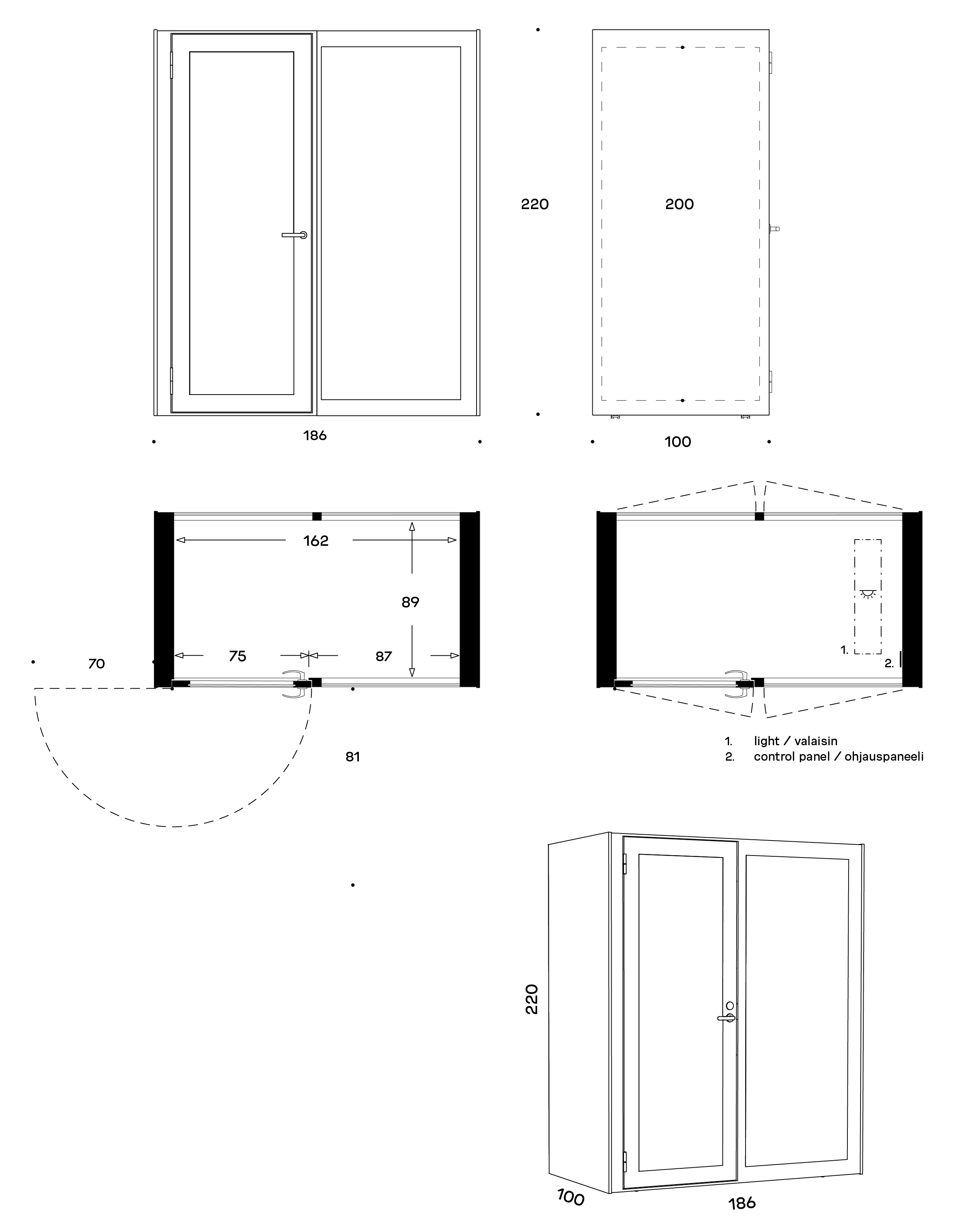 Äänieristetty ja kompakti Sono Work S -työskentelytila soveltuu hyvin videopalaverien pitämiseen sekä lyhytaikaiseen työskentelyyn. Vakiovarusteisiin kuuluvat siirtelyä helpottavat rullat, liiketunnistimella ohjattu valaistus ja ilmanvaihto. Oven paikka on valittavissa. Työskentelytilaan mahtuu 80 x 80 cm kokoinen työpöytä.