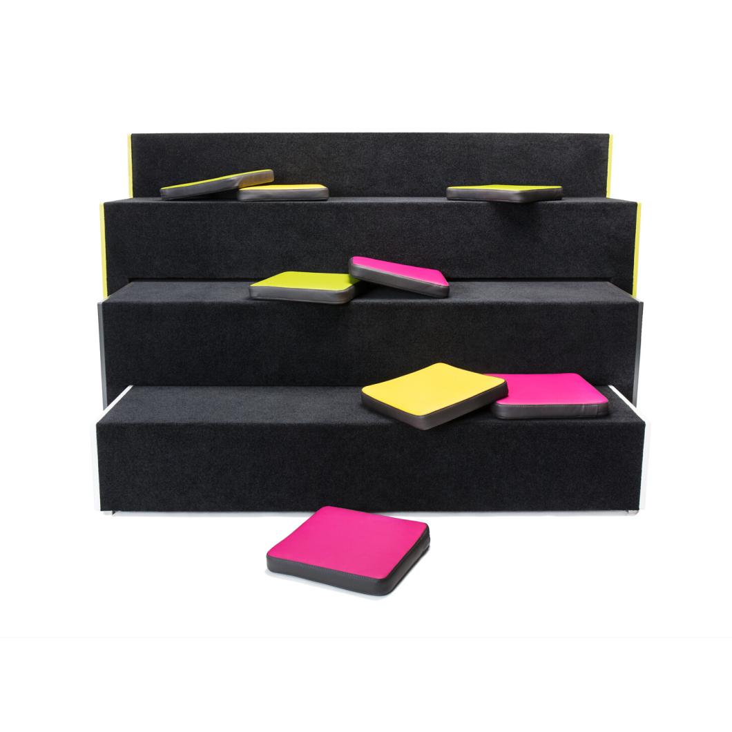 Beatbox is an auditorium-like stand for schools and working environments. It creates a cosy and relaxed meeting place for informal gatherings, as well as team work. The wheels under the stand and the telescopic structure allow the lowest steps to be inserted into the structure so that it can be moved effortlessly.