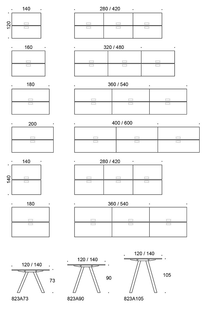 Table tops: oak, ash, stained ash, white or oak laminate, linoleums, matt laminates