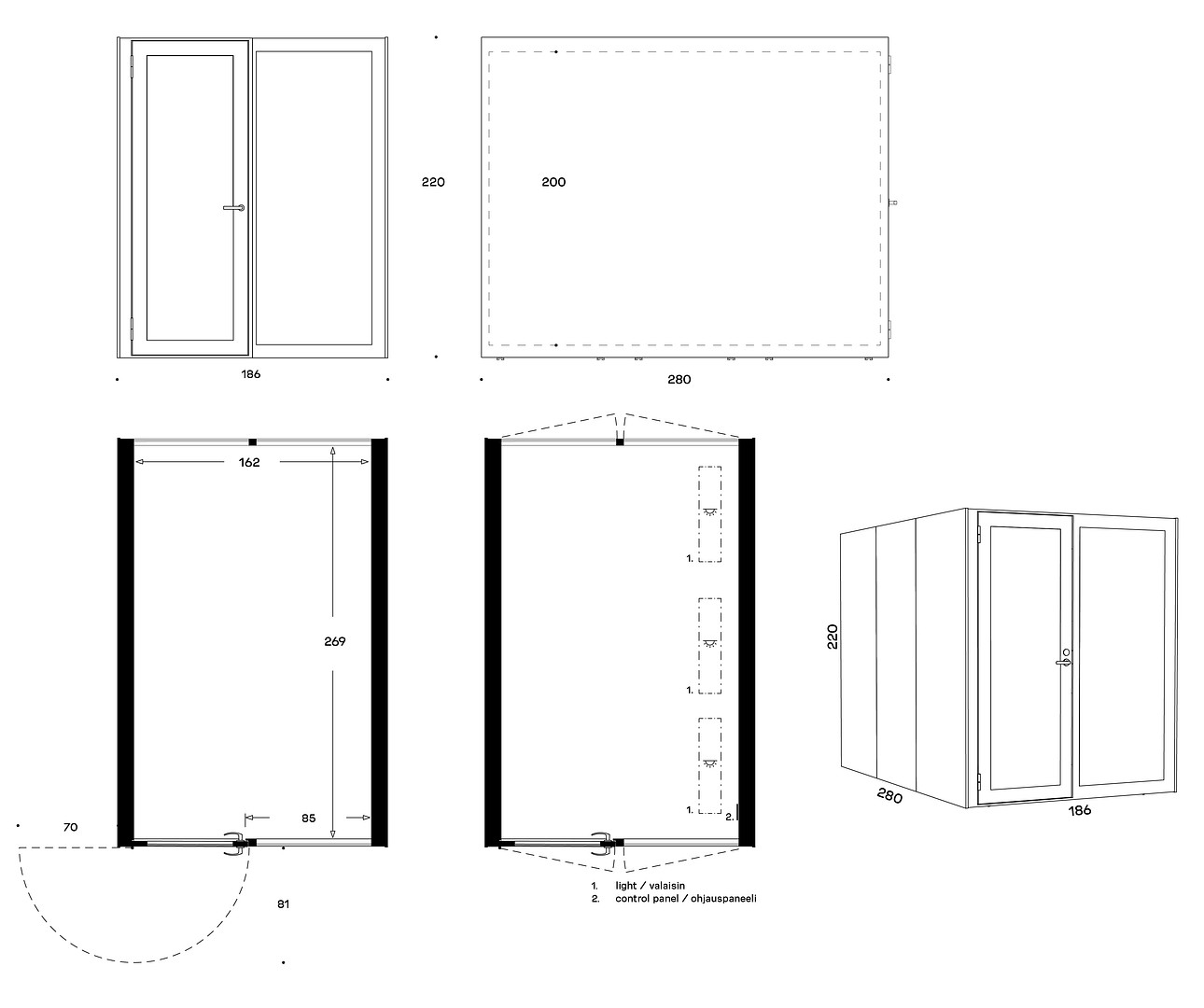 Sono Work L podden har god plass til en rekke bruksområder. Du kan for eksempel plassere to arbeidsbord ved siden av hverandre, sette inn en hjørnesofa for mer avslappede møter eller til og med gjøre rommet om til et kundemottak. Som standard får du den på hjul som gjør enheten lett å flytte på, i tillegg til at den har belysning med bevegelsessensorer og ventilasjon. Dørposisjonen kan velges.